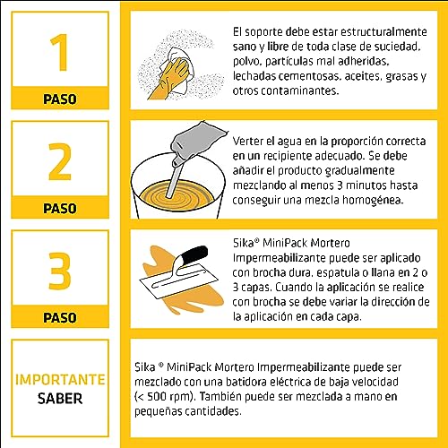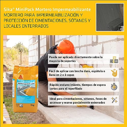 Especificaciones: Sika MiniPack Mortero Impermeabilizante, para la impermeabilización y protección de cimentaciones, sótanos, fosos de ascensor y muros enterrados, Gris, 5 kg
