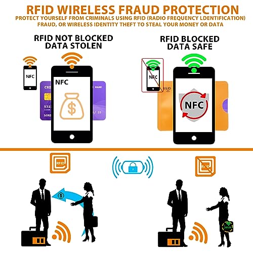 Funda para tarjeta de bloqueo RFID: la funda protectora adopta un diseño de bloqueo RFID, que puede proteger tu tarjeta de identificación, pasaporte, tarjeta bancaria, tarjeta de débito, etc. contra el robo de identidad, protege mejor tu privacidad personal. Puede prevenir eficazmente la desmagnetización de tarjetas y el robo de cepillo, fundas seguras certificadas para tarjetas de crédito que protegen contra el escaneo de chips digitales y electrónicos por ladrones para proporcionar una seguridad superior de viaje.