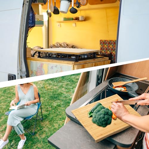 Especificaciones: Sintuff Tabla de cubierta superior para estufa de caravana, tabla de cortar para encimera con 4 patas ajustables y ranuras para jugo para caravana, remolque de gas o estufa eléctrica (17 x 20 pulgadas