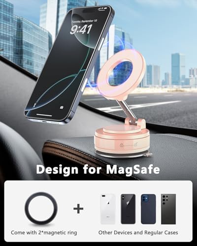 Compatibilidad universal: nuestro soporte de teléfono para automóvil está diseñado para todos los modelos de iPhone (17/16/15/14/13/12) y cualquier dispositivo compatible con Mag-Safe. Para teléfonos que no son Mag-Safe, proporcionamos un anillo magnético ultra fuerte para garantizar una sujeción segura. Ya sea que tu teléfono esté desnudo o en una funda, se enciende al instante con una sola mano