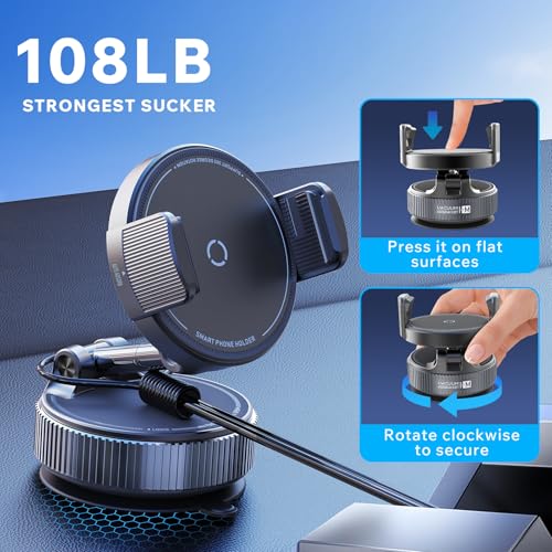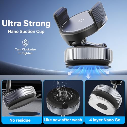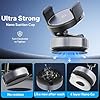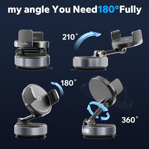 Fuerte succión: con una ventosa de nano gel de 4 capas mejorada con tecnología de sellado al vacío giratorio, este soporte para teléfono se bloquea firmemente en superficies planas con un simple giro. Se fija de forma segura a tableros de cuero, parabrisas, consolas centrales y ventanas laterales, ofreciendo una potencia de sujeción un 80% más fuerte que los soportes convencionales de estilo push, manteniéndose sólidos incluso en carreteras difíciles. (Consejo profesional: Enjuague la ventosa con agua para restaurar su agarre original si la adherencia se debilita con el tiempo)