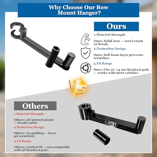 Este colgador de arco de metal resistente se adapta a la mayoría de reposacabezas de vehículos y arcos compuestos, proporcionando una solución segura, estable y duradera para transportar tu arco. A diferencia de las frágiles alternativas impresas en 3D, su sólida construcción de hierro/acero resiste grietas, dobleces y desgaste, asegurando un rendimiento duradero para camiones, SUV y otros vehículos.