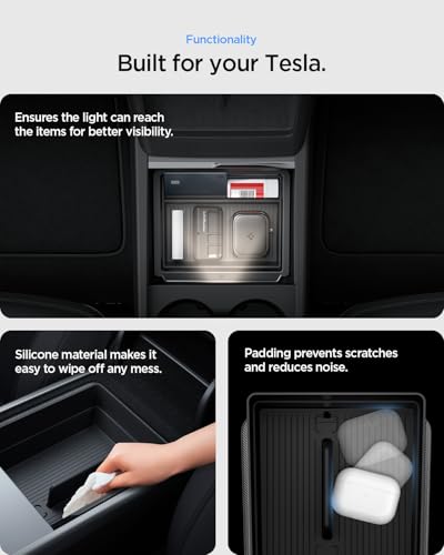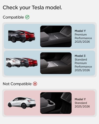 Especificaciones: Spigen Organizador de consola central y reposabrazos para Tesla Model Y Juniper (solo Premium y Performance 2025/2026) y Model 3 Highland (estándar, premium y rendimiento 2024/25/26)