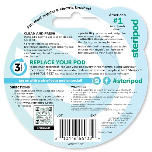 Incluye: contiene 1 protector de cepillo de dientes Steripod Clip-on, se adapta a la mayoría de cepillos de dientes manuales y eléctricos