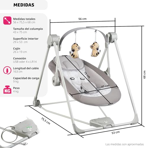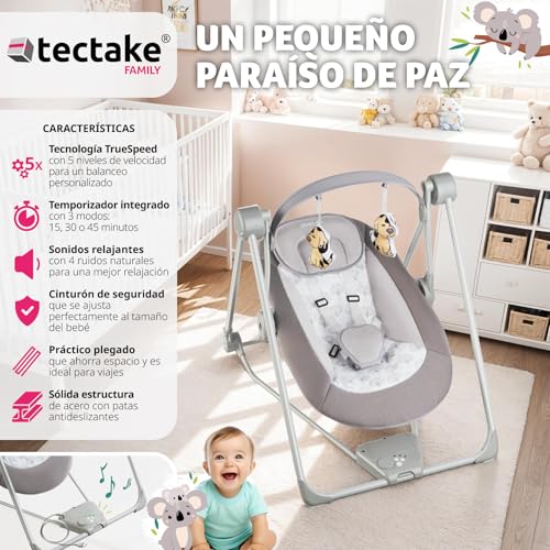 Especificaciones: tectake® Columpio Eléctrico Plegable para Bebés con Tecnología TrueSpeed, 5 Niveles, Temporizador, Sonidos de Naturaleza, Juguetes Recien Nacido, Hamaca Bebe, Columpio para Bebe – Gris Claro