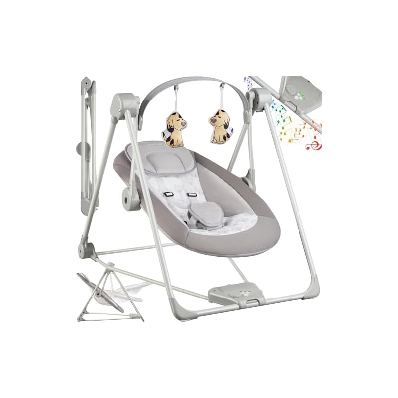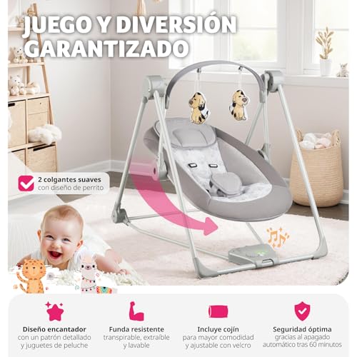 SEGURIDAD Y COMODIDAD PARA TU BEBÉ: Este columpio eléctrico para bebés está diseñado con un arco de juegos y colgantes de peluche que entretienen y estimulan a los bebés recien nacidos. Proporciona un espacio seguro y cómodo, ideal como mecedora bebe o hamaca bebe. Es un regalo para bebe que combina entretenimiento y relajación en un solo producto, y que se adapta fácilmente al desarrollo de tu bebé.