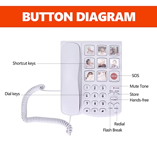 Teléfono Fijo sobremesa con Teclas Grandes, Volumen Alto, Manos Libres, Botón SOS y Silenciar Almacenar Altavoz Flash Rellamada, Teléfono de sobremesa con memoria fotográfica para personas mayores