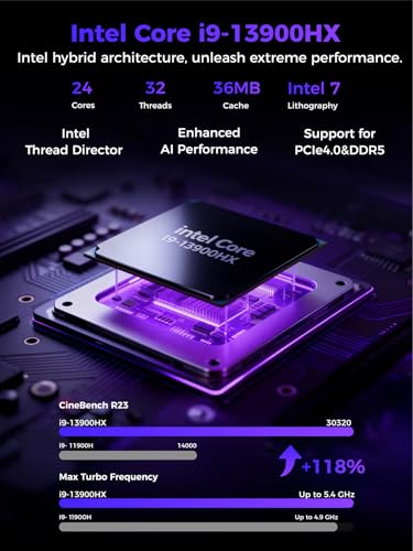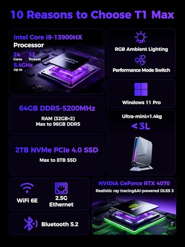 Especificaciones: TOPGRO T1-MAX Mini PC para juegos, 13ª generación i9-13900HX丨Geforce RTX4070 8G GDDR6,64GB DDR5, 2TB PCIe4.0 SSD, PC AI para juegos, iluminación RGB, HDMI2.0/DP2.0/WiFi 6E/BT 5.3/Win11 Pro computadora