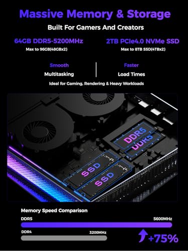 【64 GB DDR5-5200 Mhz RAM y 2TB PCIe 4.0 SSD para aceleración y despensa】Carga juegos y aplicaciones en segundos con 64 GB de RAM DDR5-5200 Mhz de alto ancho de banda y un SSD PCIe 4.0 NVMe de 2 TB. El sistema admite hasta 96 GB de expansión DDR5 de 8 TB de despensa SSD, ofreciendo flexibilidad para futuras actualizaciones. Ya sea para jugar, transmitir o trabajar, disfrute de un golpe rápido a los datos y tiempos de carga mínimos.