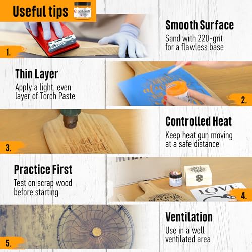 Aplicación versátil: Torch Paste es ideal para quemar diseños en madera, lienzo, mezclilla y más. Utiliza cualquier plantilla o letras que desees y crea fácilmente artículos de aspecto profesional que estarás orgulloso de mostrar. Utilízalo para diseñar artículos personalizados para tu hogar u oficina, desde carteles para interiores y exteriores hasta posavasos, tablas de queso, bandejas de servir, sombreros, chaquetas de mezclilla, camisetas y regalos únicos.