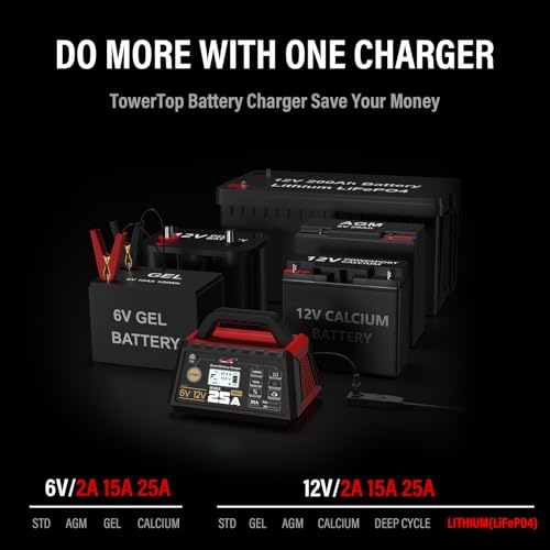 TowerTop Cargador de batería 25A Pro+, cargador de batería de automóvil de 6 V/12 V, mantenedor de batería inteligente totalmente automático con arranque del motor, desulfatador automático, reparación