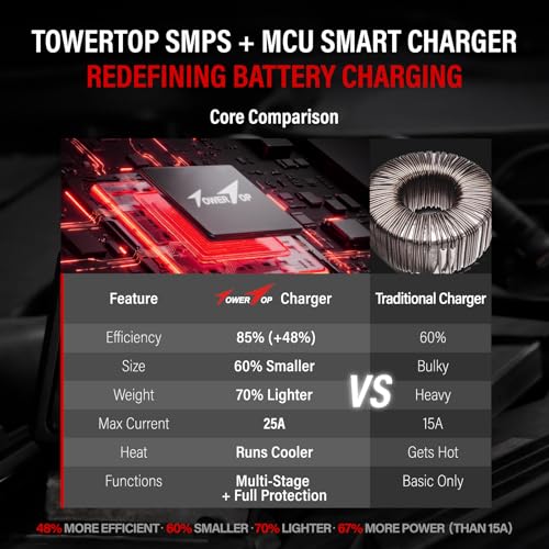 Cargador de batería inteligente y carga completamente automática: utilizando tecnología avanzada SMPS y un chip MCU autodesarrollado por TowerTop , la eficiencia de carga alcanza el 85% (el promedio de la industria es del 75%). El cargador de batería automático admite la detección, desulfatación y reparación automática de la batería. El cargador de batería automotriz TowerTop conoce mejor tu batería. En comparación con los diseños tradicionales de transformador+rectificador (60% de eficiencia), aumenta la eficiencia en un 48%, reduce el tamaño en un 60% y el peso en un 70%. Es hora de reemplazar tu voluminoso cargador anticuado
