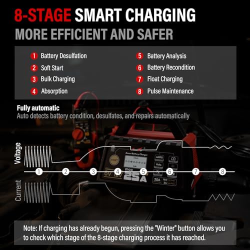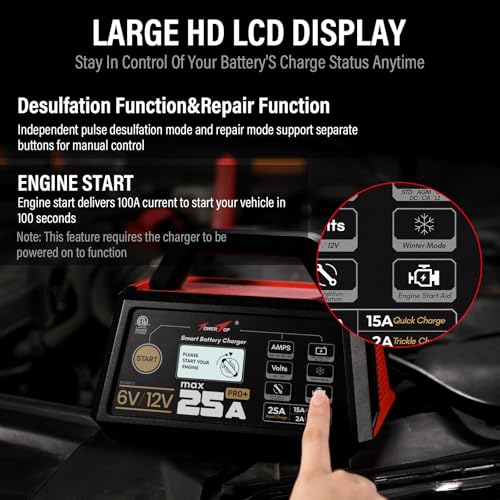 Especificaciones: TowerTop Cargador de batería 25A Pro+, cargador de batería de automóvil de 6 V/12 V, mantenedor de batería inteligente totalmente automático con arranque del motor, desulfatador automático, reparación
