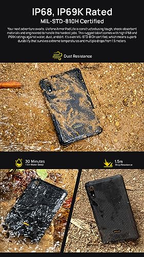 ★【Clasificado IP68, IP69K, Certificado MIL-STD-810H】Tu próxima aventura te espera. El Ulefone Armor Pad Lite está construido con materiales resistentes y absorbentes de golpes, diseñado para manejar los trabajos más duros. Esta tableta robusta cuenta con altas calificaciones IP68 y IP69K contra agua, polvo y suciedad. Incluso está certificada bajo el estándar MIL-STD-810H, lo que significa una excelente durabilidad que resiste temperaturas extremas y múltiples caídas desde 1,5 metros.