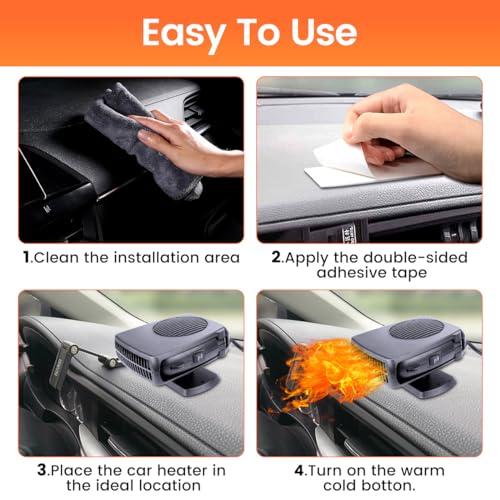 Fácil de usar: solo necesitas insertarlo en el soporte del cigarrillo del vehículo y abrirlo, puedes utilizar la almohadilla autoadhesiva proporcionada (incluida) para instalar la base, insertar el calentador en el enchufe del encendedor de cigarrillos y luego cambiar a calefacción o ventilador. Puede. Nota: Antes de usar, limpie el polvo en la superficie donde se colocará el automóvil, manténgalo seco, y luego péguelo para que sea más firme y fuerte.