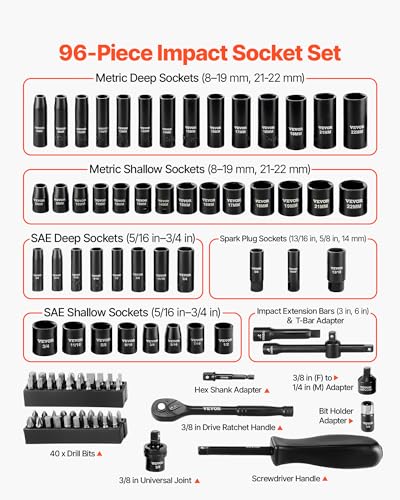 Especificaciones: VEVOR Juego de 96 llaves de impacto y puntas de 3/8 pulgadas, SAE (5/16 a 3/4 pulgadas) y métricas (8 a 0.866 in), CR-V, profundo y poco profundo, 6 puntos, trinquete, junta universal, soporte de