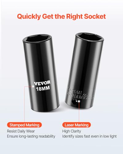 Marcas de tamaño fáciles de leer: con láser y marcas estampadas, este juego de enchufes de impacto le permite identificar rápidamente el tamaño correcto, incluso en entornos con poca luz, como trenes de aterrizaje de automóviles. El diseño estampado resiste el desgaste para una legibilidad duradera