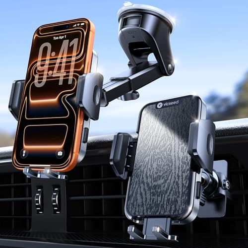 VICSEED Soporte para teléfono de coche con ventosa ultra estable [base giratoria de 360°, liberación de doble botón] 3 en 1 tablero de instrumentos/parabrisas/ventilación para camión y barco soporte