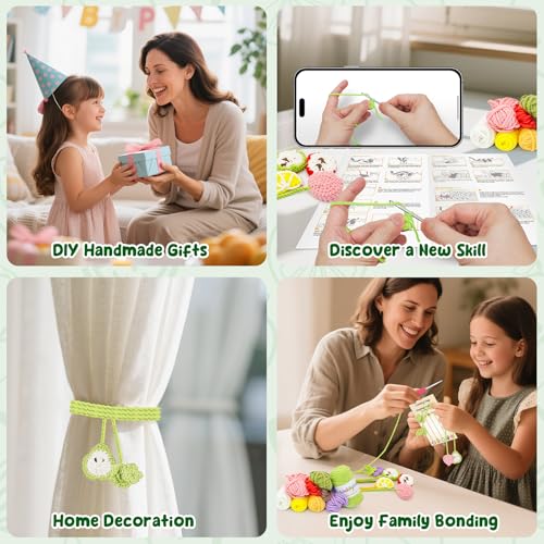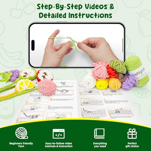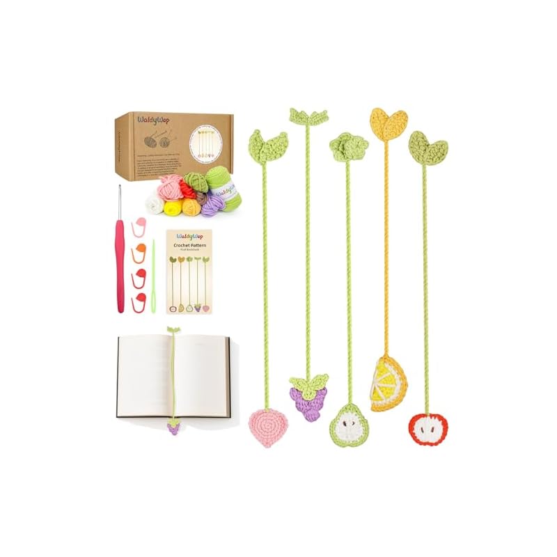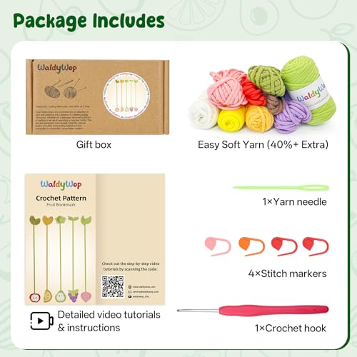 Especificaciones: WaldyWop Kit de ganchillo para principiantes: 5 marcapáginas de frutas con 40% de hilo extra, accesorios – Tutoriales en video fáciles e instrucciones para adultos niños de 8 a 12 años – Juego de