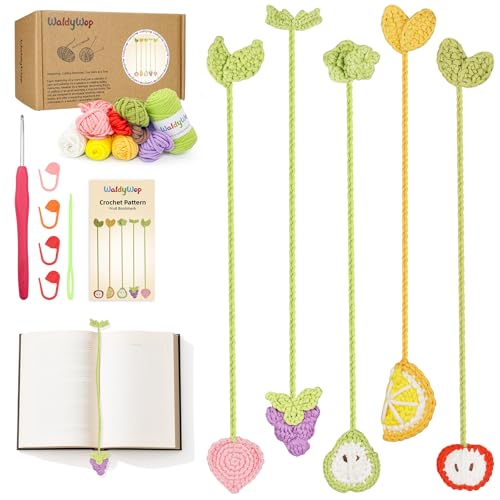 WaldyWop Kit de ganchillo para principiantes: 5 marcapáginas de frutas con 40% de hilo extra, accesorios – Tutoriales en video fáciles e instrucciones para adultos niños de 8 a 12 años – Juego de