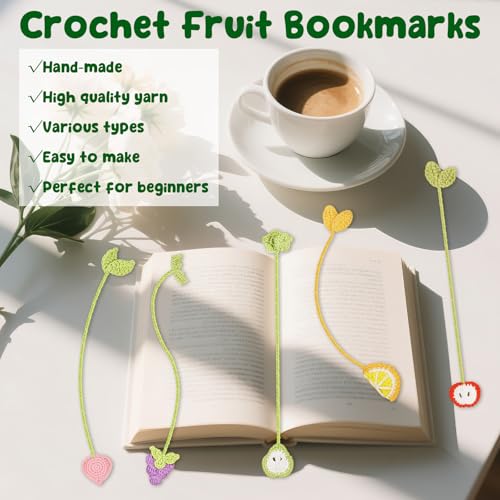 Diseño parcial de marcapáginas: este kit de marcadores de ganchillo te permite crear 5 adorables marcadores con temática de frutas, perfectos para el uso diario. Estos marcadores de frutas son lindos y útiles, combinando creatividad con función. Es un proyecto ideal para aprender a ganchillo para niñas y mujeres que aman los libros y manualidades, ofreciendo una sensación de logro con cada pieza terminada.