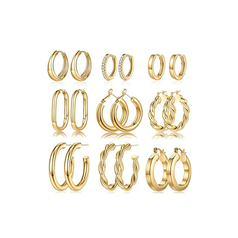 Yesteel 9 pares de arracadas de oro para mujer, chapadas en oro real de 14 quilates, gruesos, hipoalergénicos y ligeros para mujer, regalos de joyería de oro